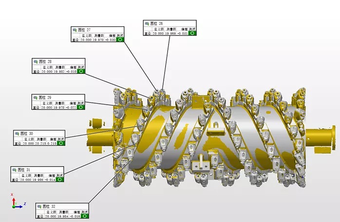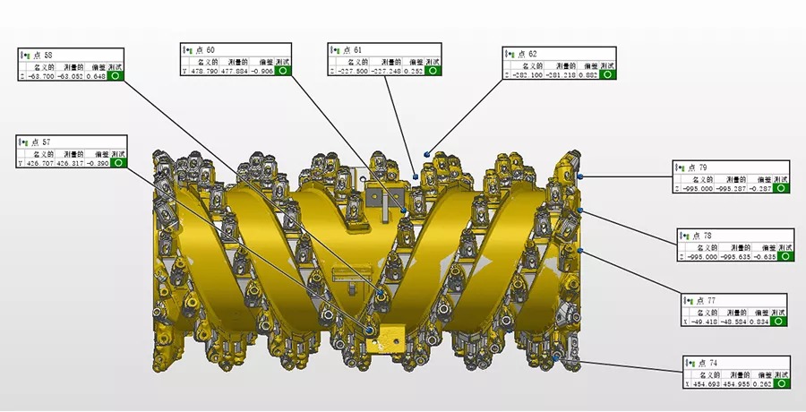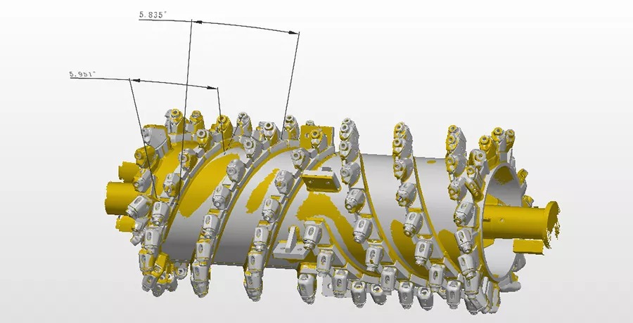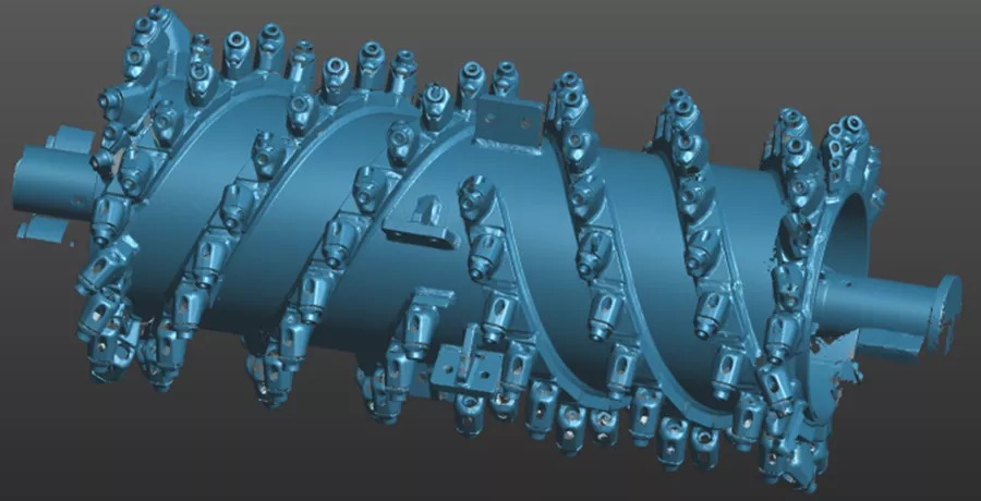銑刨鼓是道路銑刨機的核心,需經(jīng)過嚴(yán)格的檢測,以避免磨損以及變形的負(fù)荷縮短設(shè)備使用壽命。過去采用接觸式打點來進(jìn)行檢測,不但測量速度慢,而且測量死角多,測量數(shù)據(jù)不全,且銑刨鼓的刀頭為活動刀頭,裝配后測量無法測得準(zhǔn)確的刀頭點位。