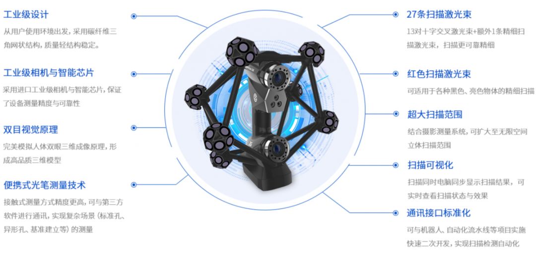 【適用領(lǐng)域】:質(zhì)量檢測(cè)與控制、逆向設(shè)計(jì)、數(shù)字展示、汽車制造、模具制造、航空航天、重工機(jī)械、醫(yī)療健康、3D打印、教 育科研、VR·AR等;