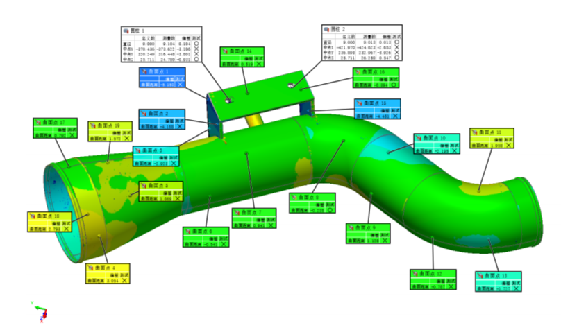 使用RigelScan掃描管徑在45~150mm范圍、形狀不一的卡車排氣管/中冷氣管產(chǎn)品,結(jié)合PolyWorks軟件檢測(cè)管件產(chǎn)品的整體形變及彎曲角度、裝配面、斷面圓心偏差等。